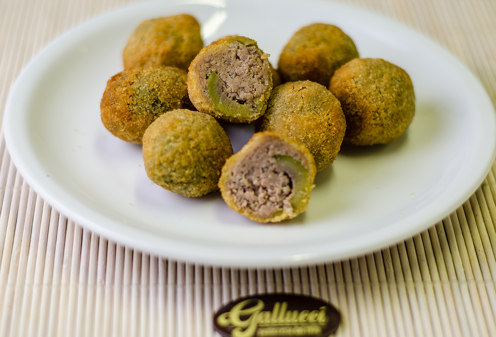 Specialità locale. Una panatura dorata racchiude una morbida oliva verde farcita con un gustoso ripieno di carne