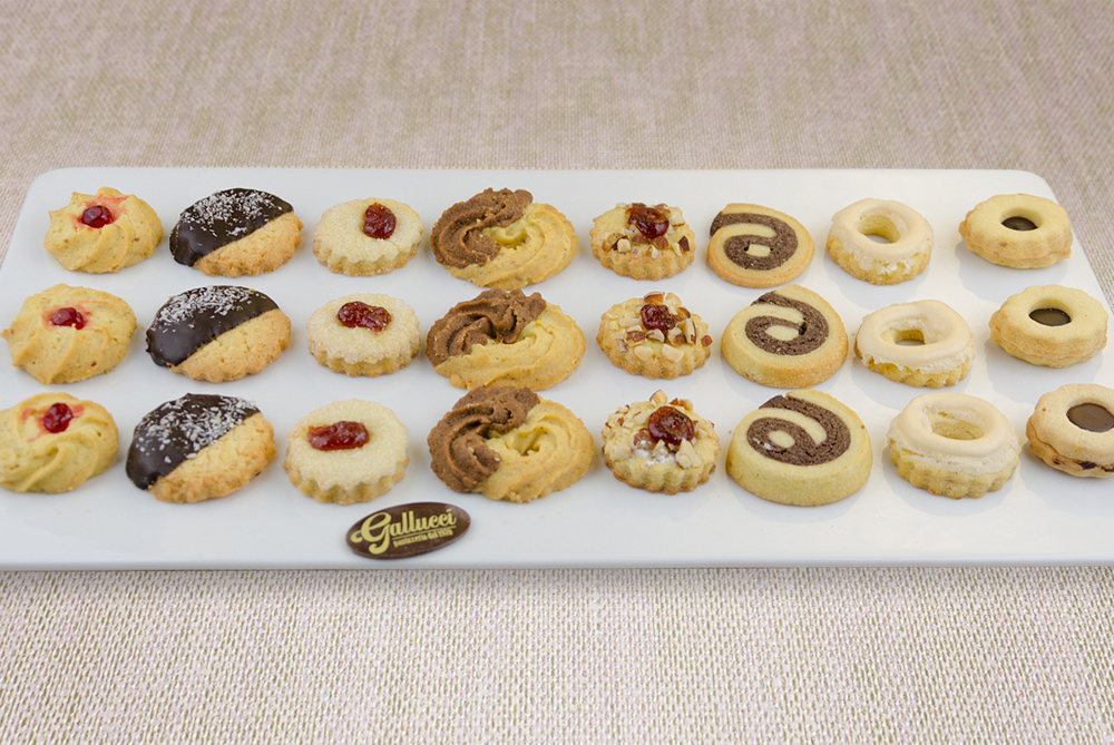 Frolla montata, biscotti al cocco, margherite di zucchero, abbracci, margherite. Alla mandorla, girelle al cacao, ciambelline con glassa e occhio di bue al cioccolato.