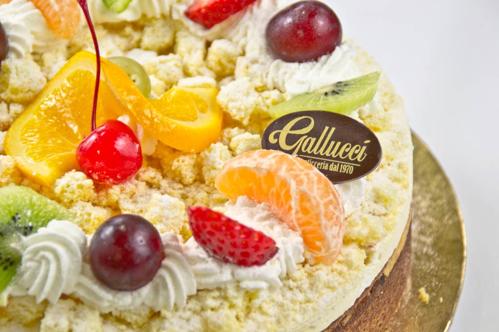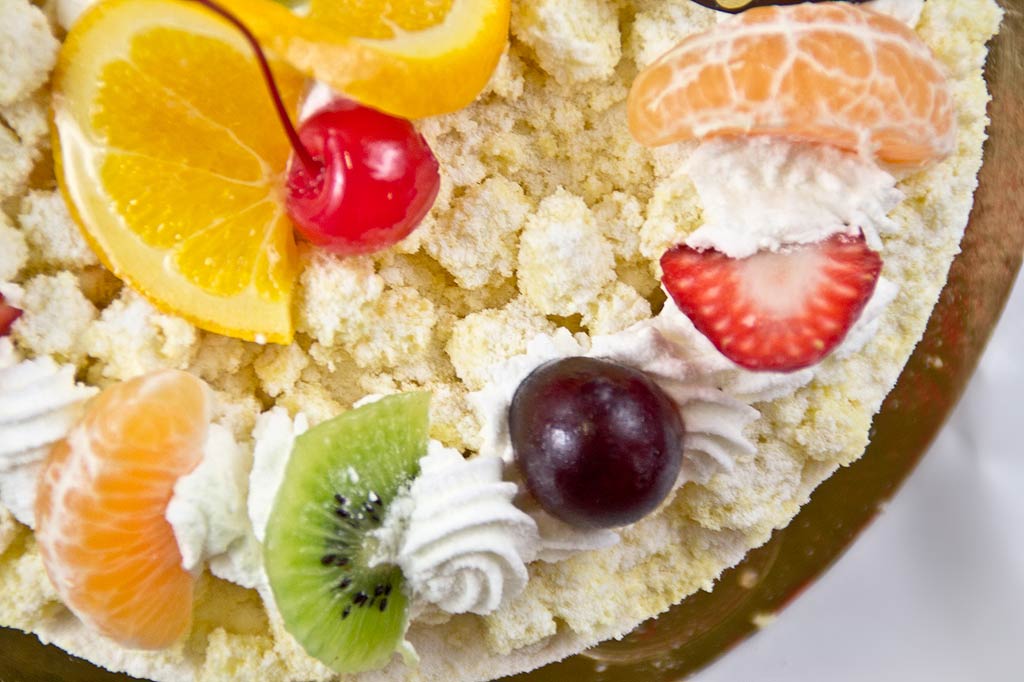 Un sottile fondo di morbido pan di spagna bagnato con liquore all’arancia, crema chantilly al leggero gusto di zabaglione, macedonia di frutta fresca e sciroppata, ancora pan di spagna bagnato all’arancia, un ultimo strato di crema chantilly sempre allo zabaglione e per finire una cascata di cubetti di morbido pan di spagna per riprendere vagamente la forma dell’omonimo fiore.