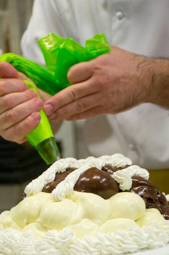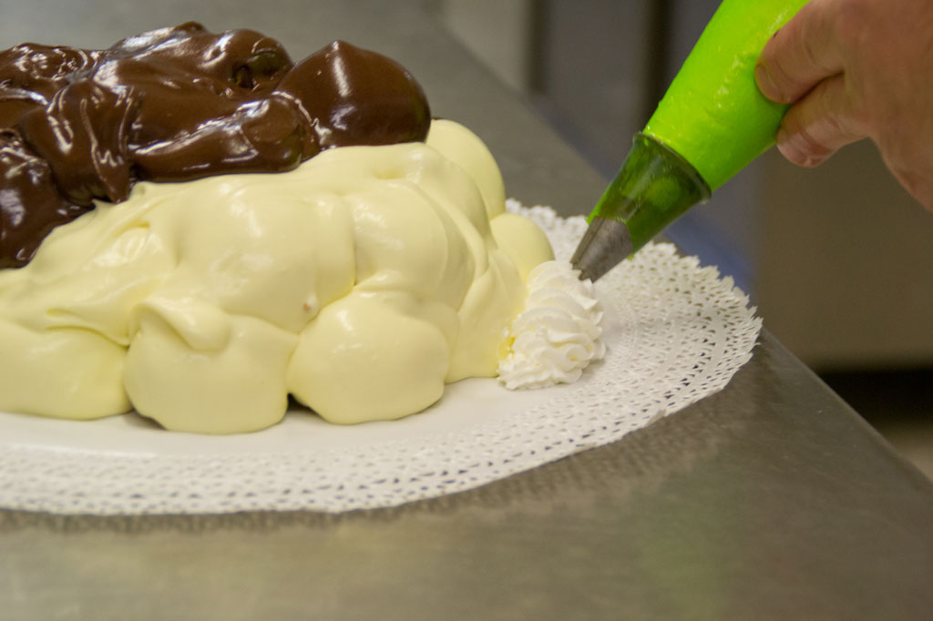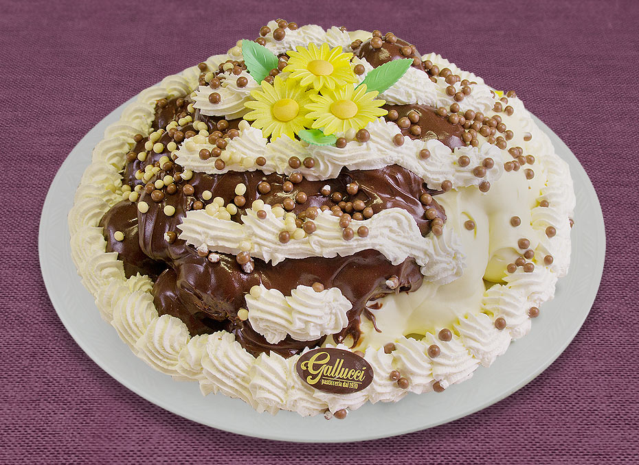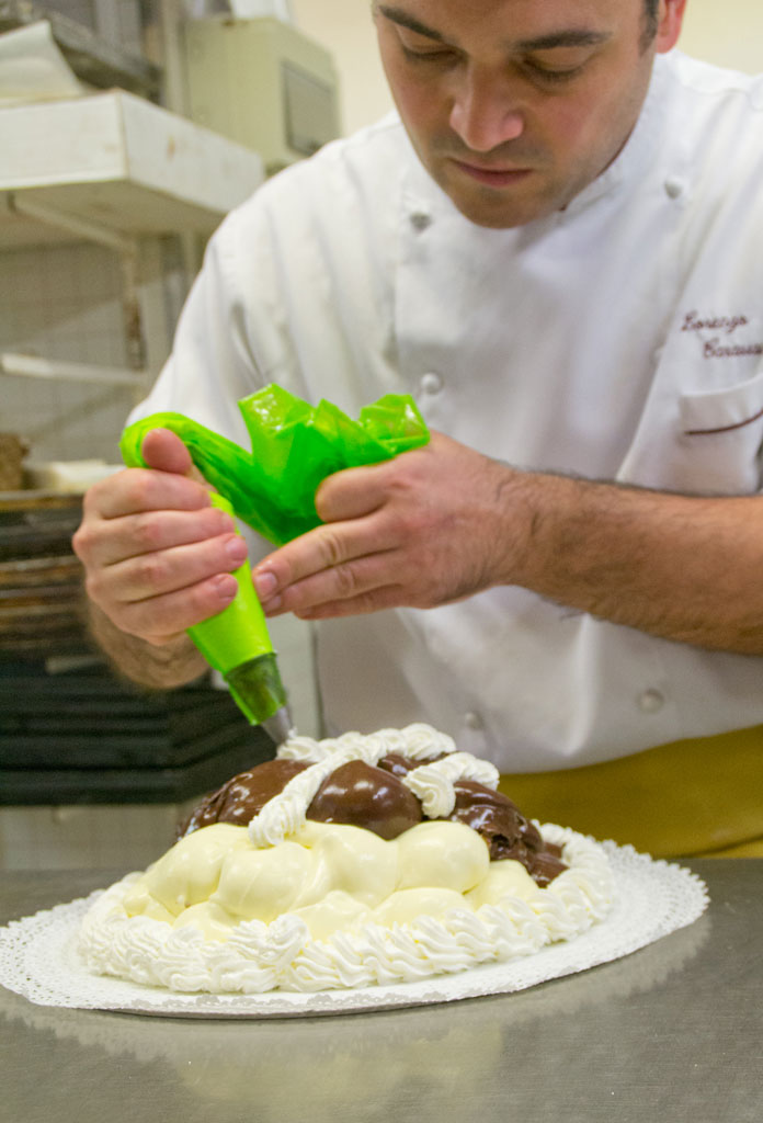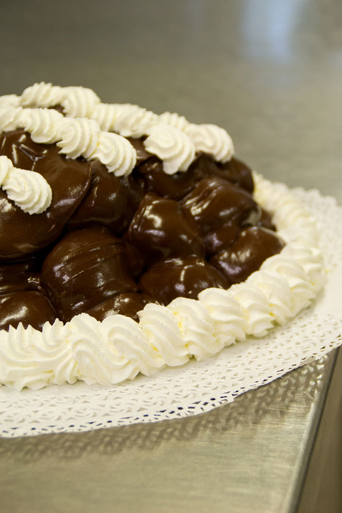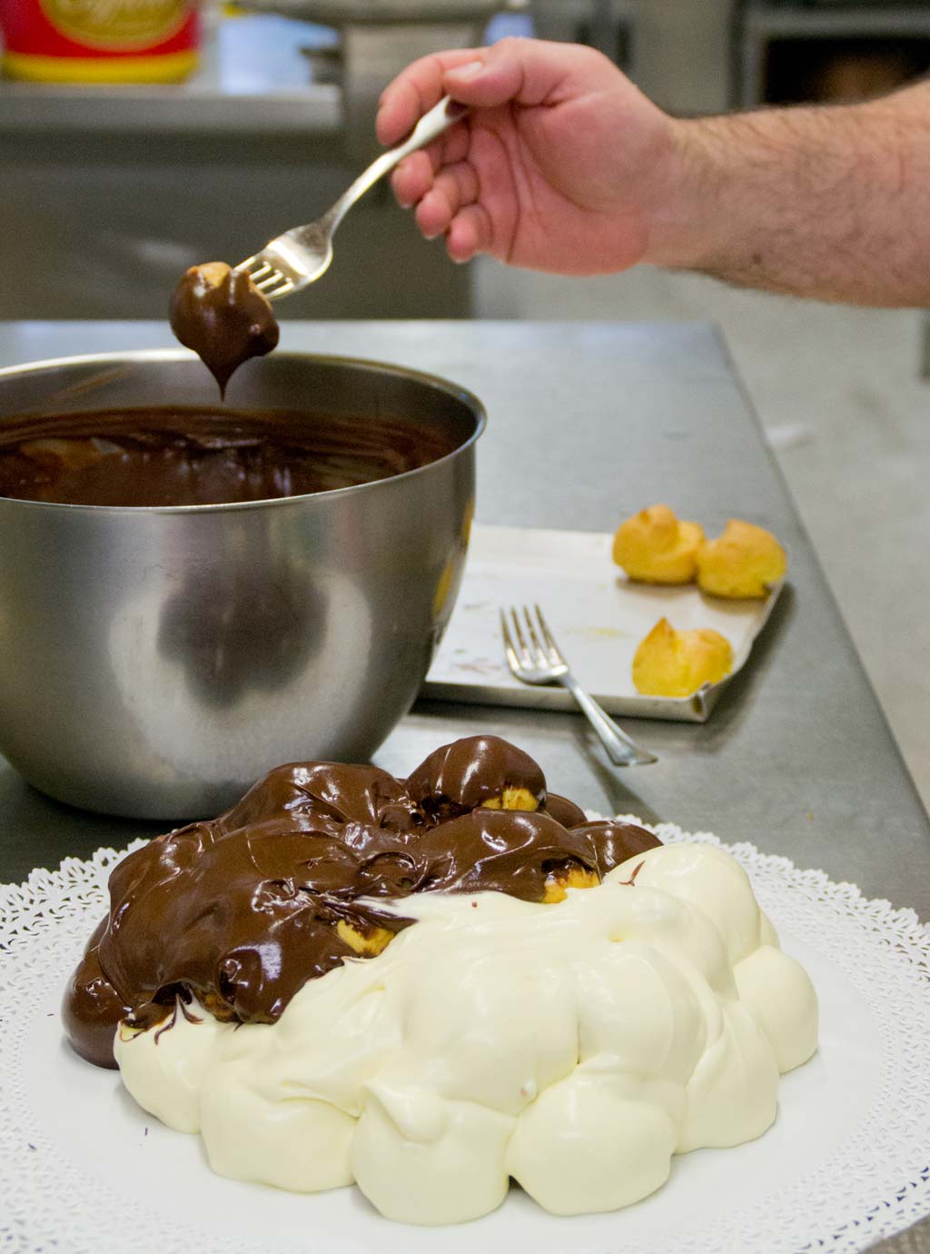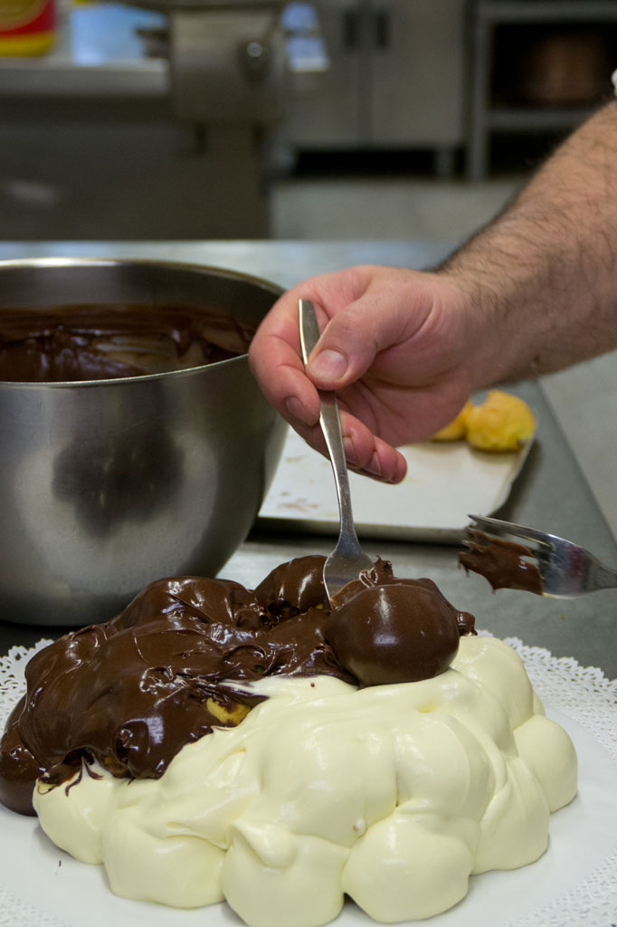 Piccoli bignè ripieni di crema pasticcera immersi nella salsa di cioccolato fondente e assemblati a piramide uno accanto all’altro nella tradizionale forma ovale.