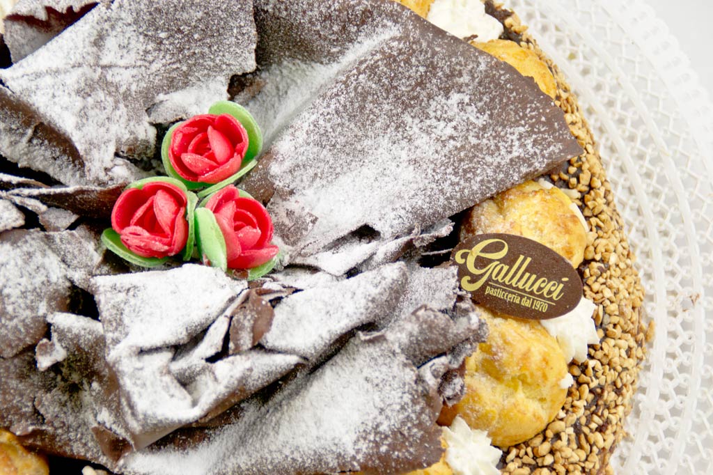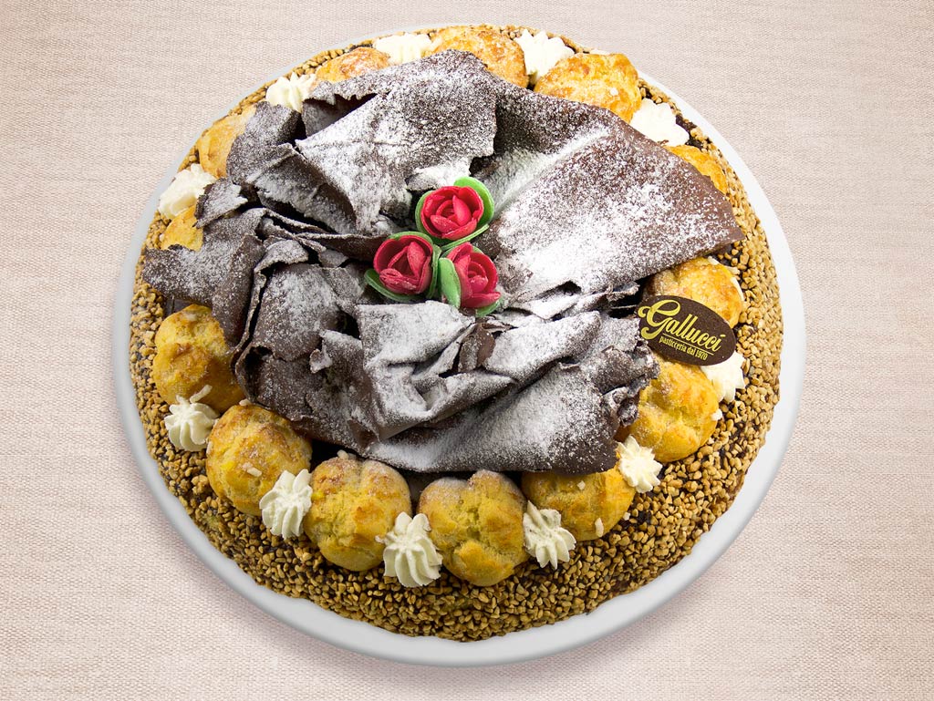 Un fondo di sfoglia, crema al cioccolato, pan di spagna bagnato con un liquore al rhum, crema al cioccolato, un giro di bignè zuccherati ripieni di crema pasticcera sulla circonferenza superiore, al centro panna montata spolverata con granella di cioccolato fondente mentre il bordo esterno è ingranato con riso soffiato.